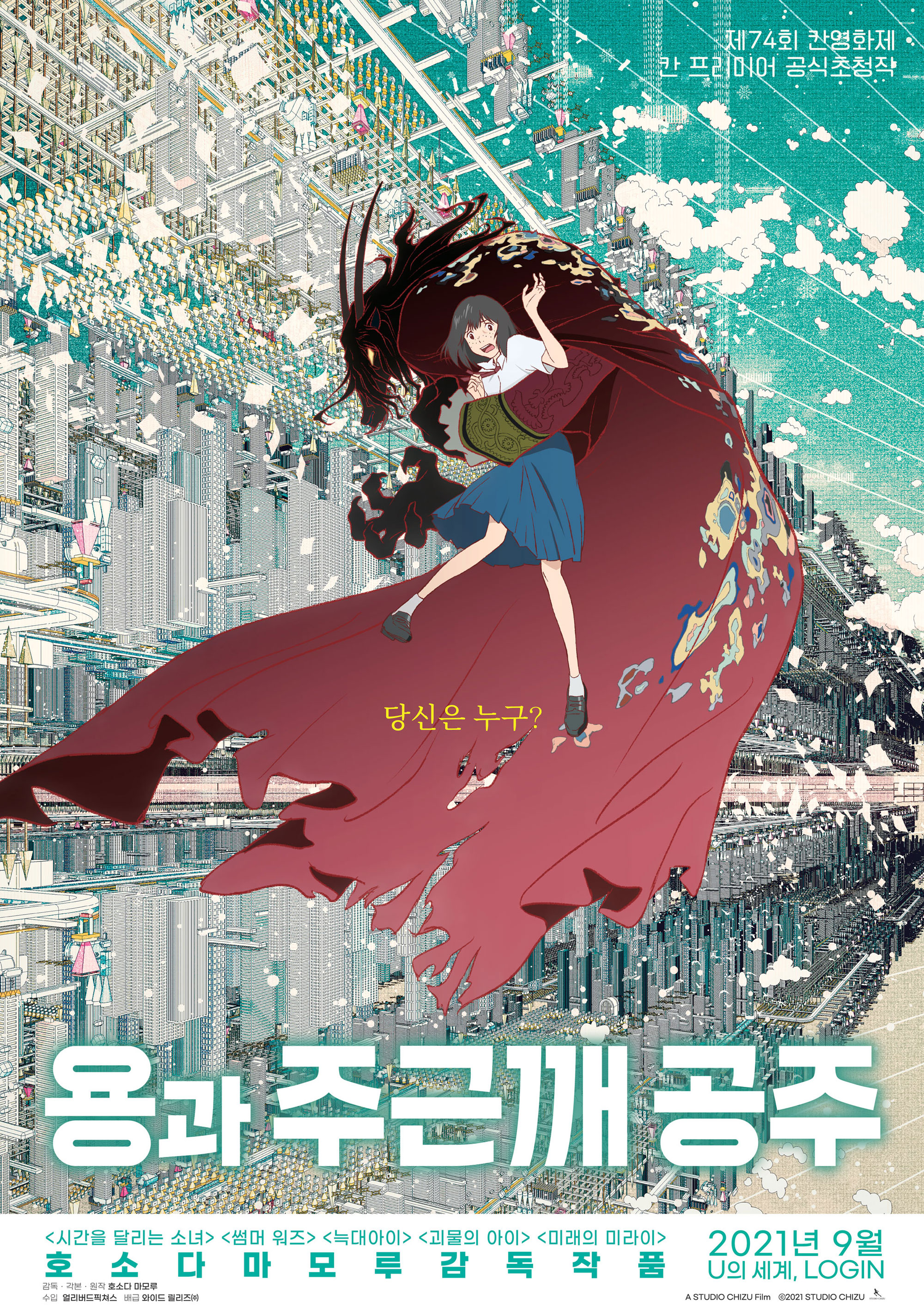 U에서 벨의 라이브 콘서트가 열리기로 한 날, '용'이라고 불리는 캐릭터와 U의 정의와 질서를 지키는 저스티스 집단이 나타나 콘서트장은 엉망이 됩니다. 하지만 상처와 사연이 있어 보이는 '용'에게 자꾸 신경이 쓰이는 스즈는 '용'을 찾아다닙니다. 마침내 용이 지내고 있는 성을 찾아내 이야기를 나누려 하지만 용은 스즈와 거리를 두려 합니다. 용의 상처를 보듬어주고 싶은 벨은 용에게 진심이 담긴 노래를 들려주며 위로해 줍니다. 하지만 용을 쫓고 있었던 저스티스에게 용과 함께 있는 모습을 들키게 된 스즈는 저스티스에게 붙잡히고 맙니다. 저스티스는 용이 어디에 있는지 밝히지 않으면 스즈의 현실세계 모습이 드러나도록 언베일 할 거라고 협박하는데... 스즈는 과연 이 위기에서 벗어나 용을 구해낼 수 있을까요?