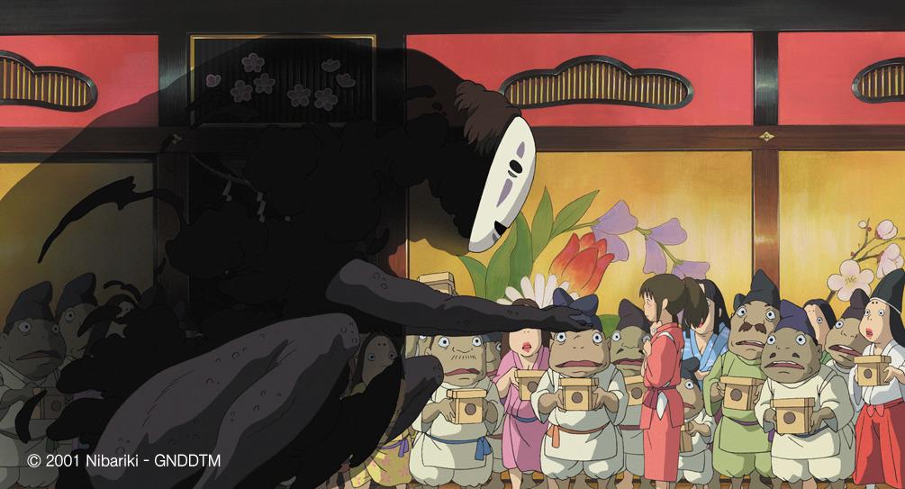 탐욕만 쫓아 허겁지겁 먹던 부모님은 돼지로 변해버리고, 치히로는 놀라서 도망치다가 정체불명의 소년 하쿠를 만나게 됩니다. 하쿠의 도움으로 신의 세계로 무사히 넘어온 치히로는 일을 해야 살아남을 수 있다는 하쿠의 말에 온갖 신들이 드나드는 온천장의 주인인 유바바를 무작정 찾아가 일을 하게 해달라고 합니다. 물질적인 욕심이 많은 유바바는 누구든 진짜 이름을 빼앗고 개명된 이름을 쓰게 하여 자신의 정체성을 잃어버리고 노예처럼 일만 하도록 지배합니다. 치히로도 자신의 이름은 빼앗기고 '센'이라는 이름으로 온천장 종업원 일을 하게 되는데... 그곳에서 벌어지는 가오나시와의 소동과 자신을 도와주었던 하쿠의 문제를 담담하고 용감하게 해결해 나가는 장면들이 인상적입니다.
